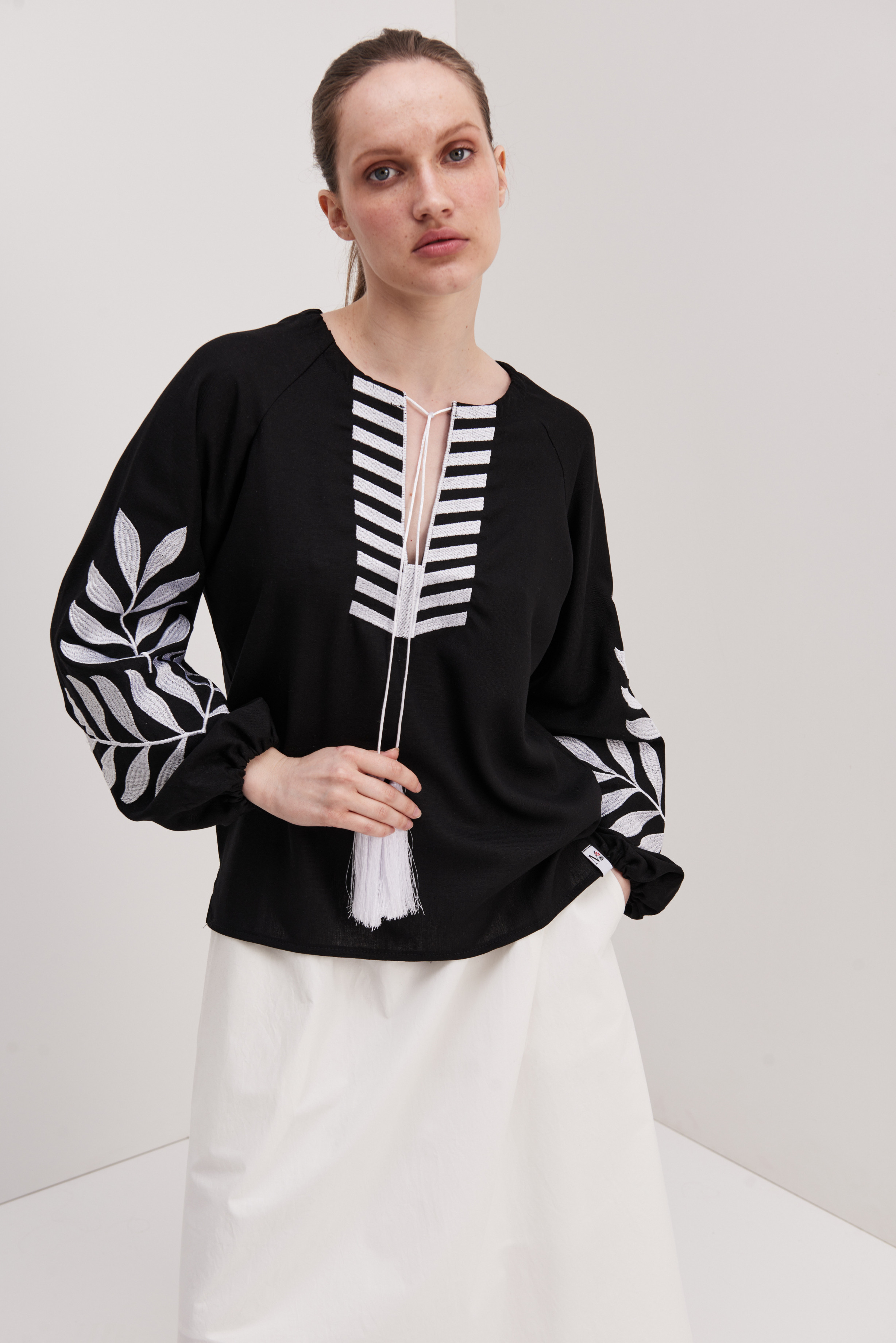 Блуза виконана з вишуканого чорного льону, що підкреслює елегантність своєї власниці, а ніжна біла вишивка створює контраст і додає образу чарівності. Вільний крій та об'ємний рукав на резинці надають виробу легкості і комфорту, а також відображають традиційний український стиль, одночасно створюючи відчуття сучасності.