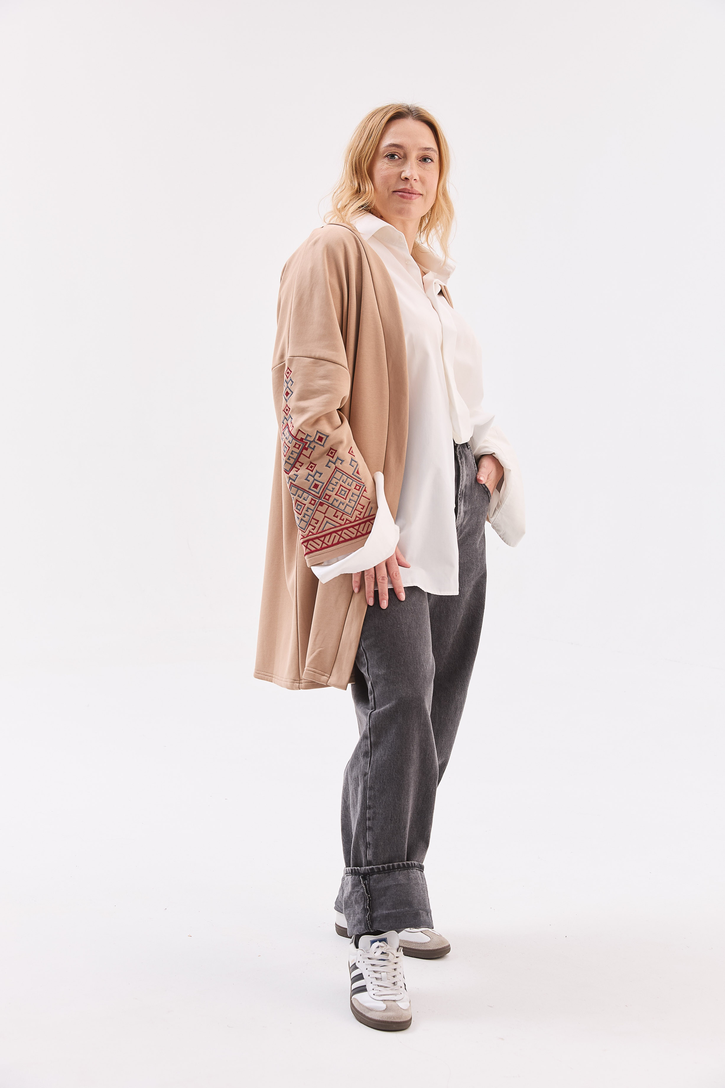 Кардиган Символ - це гармонійне поєднання сучасного стилю та старовинної символіки, що зберігає культурний спадок. Фасон кімоно зі спущеним плечем, широкими рукавами і вільним силуетом дарує абсолютний комфорт і свободу рухів, водночас підкреслюючи індивідуальність. Ніжно-бежевий трикотаж тринитка створює лаконічний дизайн у поєднанні з контрастною червоно-сірою вишивкою гладдю, яка привертає увагу витонченими деталями та змістовними символами.