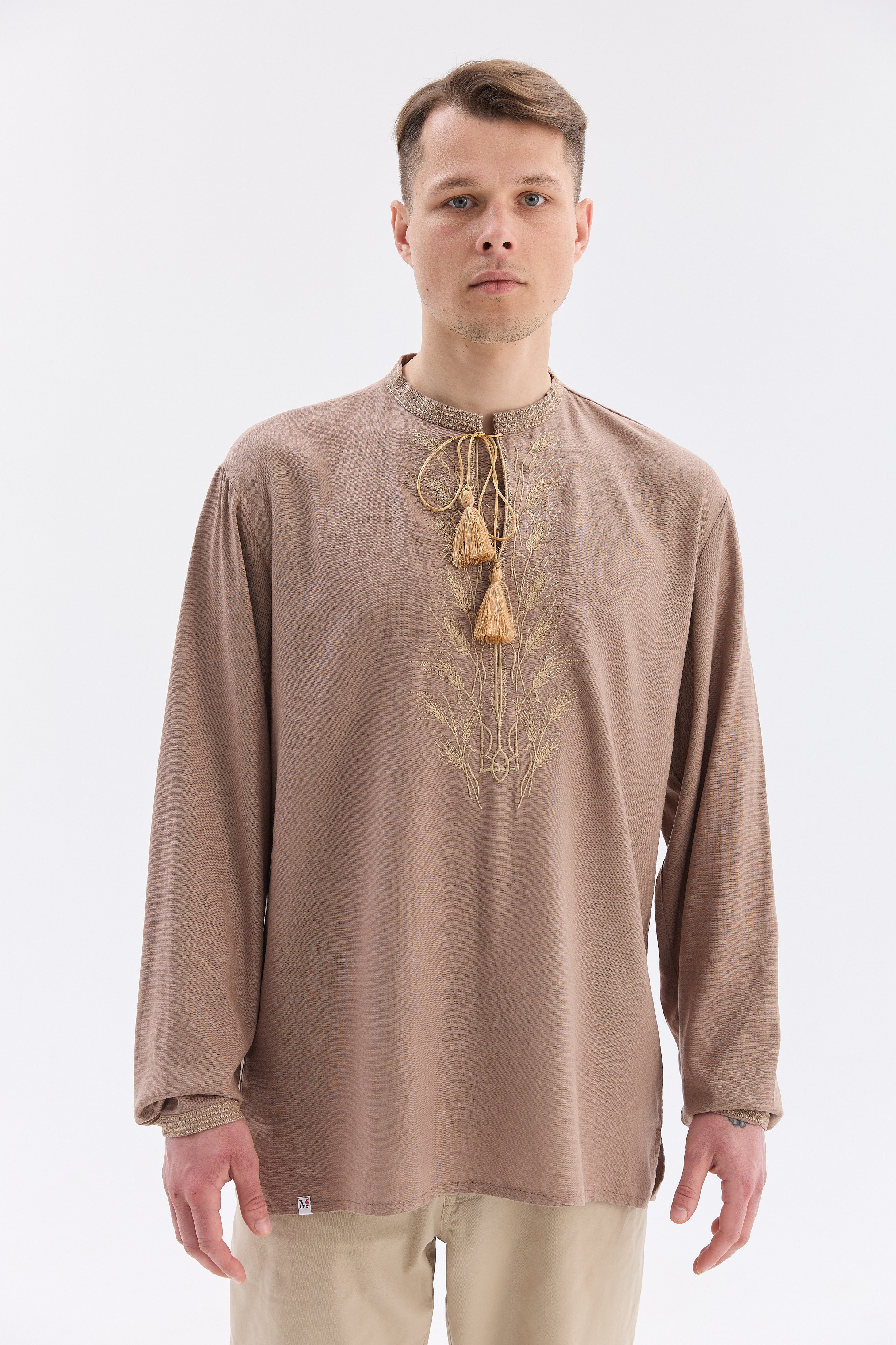 Чоловіча вишита сорочка Незламний – це символ стійкості, гордості та відданості своїй культурі. Її дизайн поєднує сучасну естетику й глибоку символіку, що відображає силу духу та невичерпну енергію українського народу. Вишиванка має прямий вільний крій, який забезпечує комфорт і стильний вигляд. Тканина виконана з натурального льону темно-бежевого відтінку, що надає сорочці благородності та універсальності, які підсилює вишивка гладдю в однотонному золотавому відтінку.
